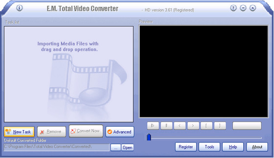 E.M. Total Video Converter - это очень мощная программа, которая позволяет конвертировать любые видеофайлы в форматы 3gp (формат мобильных телефонов и наладонников), mp4, psp, iPod, swf, flv, DVD, VCD. Total Video Converter поддерживает чтение и проигрывание большого количества видео и аудио форматов (3gp, mp4, psp, iPod, swf, flv, DVD, VCD, mp3, ac3, ogg, wav, aac...), а также конвертирует их в популярные video/audio форматы и форматы мобильных телефонов и наладонников. Присутствует возможность извлечения аудио из видеотреков и сохранение в mp3, ac3, ogg, wav, aac.