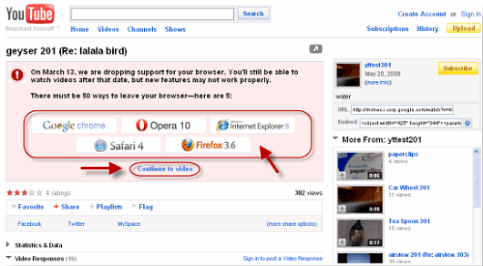 Компания Google объявила о том, что намерена отказаться от поддержки браузера Internet Explorer 6 своими сервисами Orkut (социальная сеть) и YouTube (видеохостинг) более 6 месяцев назад. Она достаточно активно продвигает переход на новые, более современные браузеры.