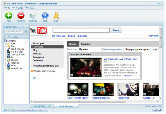 Youtube Music Downloader - простая в использовании программа для скачивания HD/HQ видеороликов с портала youtube и конвертации их в такие форматы, как MP3, AVI, WMV, MOV, MP4, 3GP. Вы сможете скачать тысячи видеороликов с сайта youtube и слушать их на своем MP3 плеере или iPod и смотреть их на iPod, iPhone или компьютере. Неограниченные возможности скачивания видеороликов! Начните прямо сейчас!