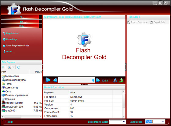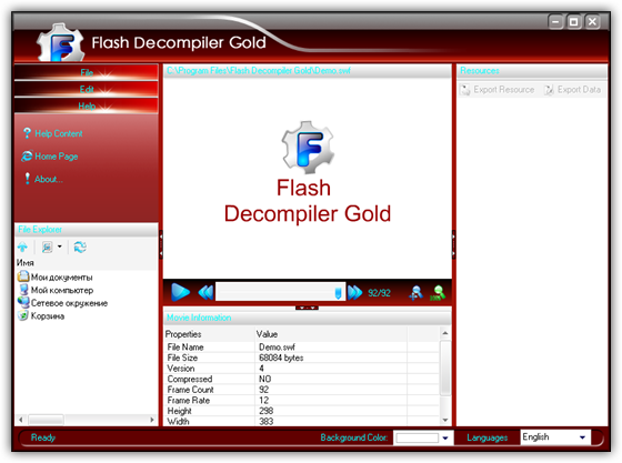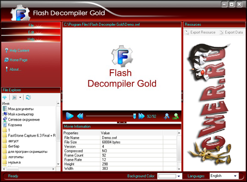 Flash Decompiler Gold - мощная программа для извлечения ресурсов из флэш файлов. Экспортирует изображения, звуки, шрифты, тексты, кнопки, спрайты, скрипты и фреймы из любого SWF файла.