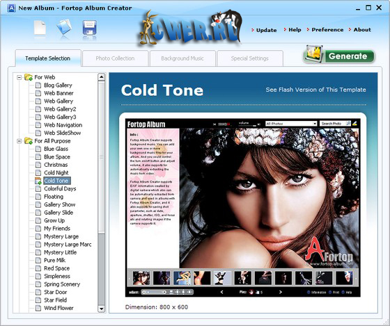 Fortop Album Creator позволит вам быстро и легко создать потрясающий фотоальбом на Flash. Программа обладает широким выбором шаблонов, имеющих поддержку фоновой музыки и полностью готовых к использованию. Все что вам необходимо, это выбрать шаблон, указать необходимые фотографии и музыку для вашего альбома и позволить Fortop Album Creator выполнить всю остальную работу. Создание альбомов лимитировано 30-ю снимками. Вы можете классифицировать каждую фотографию и использовать такую EXIF-информацию, как например дату создания, тэги, автора и комментарии для того, чтобы легко найти ваши снимки.