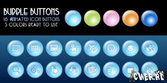 16 анимированных иконок внутри флеш кнопок, которые имитируют водные пузырьки, доступны в 5 цветах. В архиве находятся файлы SWF, FLA и HTML форматов.