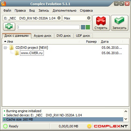 Complex Evolution - это программа для записи всех типов дисков CD/DVD, включая загрузочные и UDF, а также записи образов, включая mds - Alcohol 120%. Ее отличает уникальная легкость в освоении даже для неподготовленного пользователя. Разработчики сознательно отказались от каких-либо второстепенных свойств и сосредоточились на двух основных требованиях - простоте и удобстве использования. Однако это не сказалось на качестве работы программы, где ее основные функциональные возможности оказались на уровне (а зачастую и выше) более сложных программных продуктов.