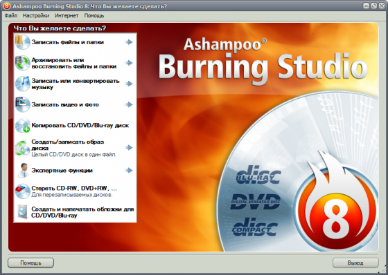Ashampoo Burning Studio - новейший пакет программ для записи CD-RW, DVD-RW, DVD+RW и Blu-ray. Позволяет создавать проекты и записывать CD/DVD (в том числе MP3-CD, VCD, S-VCD и Blu-ray). Поддерживает длинные имена файлов (127 знаков для DVD и Blu-ray и 64 для CD), автоматическую настройку параметров, сохранение и загрузку проекта, создание образов, простое управление файлами с помощью Drag&Drop и многое другое. Работает совместно с большинством (порядка 1700) записывающих устройств.