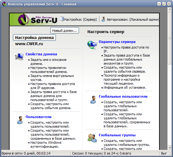 Serv-U File Server - гибко настраиваемый файловый сервер для операционных систем Windows. Как один из самых популярных в отрасли, Serv-U имеет богатую историю как надежный, быстрый и многофункциональный сервер, что является жизненно важным для администраторов. Функции безопасности обеспечиваются паролями и установкой прав на запись/чтение/изменение для каталогов и файлов для каждого пользователя, а также контролем доступа по IP-адресам. К другим особенностям относится поддержка одновременной работы нескольких пользователей, установка коэффициентов для upload/download, установка дисковых квот, поддержка возобновления приема-передачи, поддержка SSL для обеспечения безопасных соединений, мониторинг работы пользователей в реальном времени и ведения логов.
