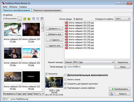 Программа для различных манипуляций с графическими файлами. С помощью FastStone Photo Resizer можно конвертировать изображения в распространенные графические форматы (JPEG, JP2, TIFF, BMP, PNG, GIF), изменять размер и глубину цвета, обрезать, разворачивать под разными углами и переименовывать графику. Кроме того, присутствует возможность накладывать цветовые эффекты, добавлять текст и водяные знаки. Все эти действия могут проводиться как для одного файла, так и в пакетном режиме. Поддержка технологии Drag&Drop обеспечивает нужную простоту работы с программой. Настройки утилиты можно сохранять, а также загружать ранее выставленные предустановки. При обработке папок программа сохраняет структуру подкаталогов.