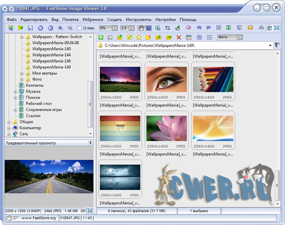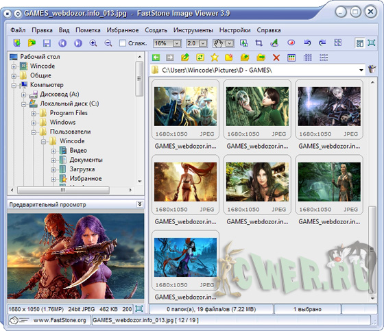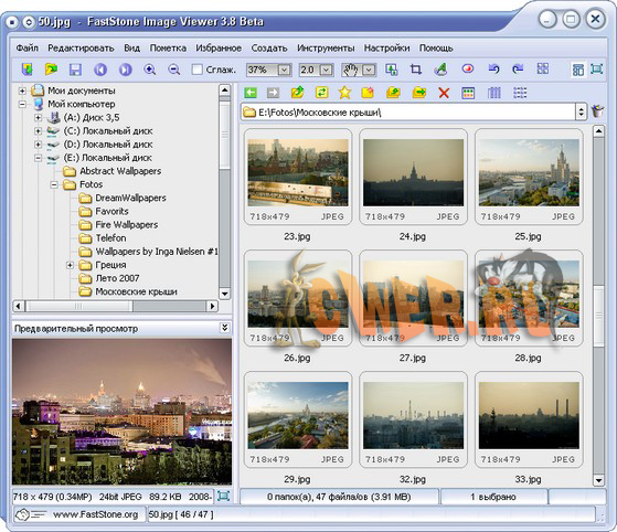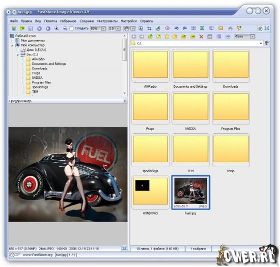 FastStone Image Viewer - вьювер, редактор и конвертор графических файлов. Поддерживает все популярные форматы графики, включая JPEG, JPEG 2000, GIF, PNG, PCX, TIFF, WMF, BMP, ICO, RAW и TGA. Обладает простым и удобными интерфейсом, сочетая его с большим количеством полезных возможностей. Поддерживается пакетное изменение размеров и переименование картинок, удаление ненужных фрагментов, подгонка и изменение цветов, установка водяных знаков и т.д. и т.п. Имеется возможность создавать слайдшоу с более чем 150 эффектами перехода и фоновой музыкой, присутствует различные графические эффекты, ZOOM, полноэкранный режим, поддержка работы со сканером и т.д. Кроме всего этого, программа умеет делать скриншоты экрана, причем как экрана целиком, так и любой его части.