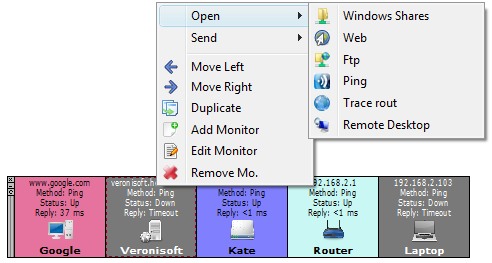 Veronisoft IP Monitor - является программным обеспечением для контроля сети, которое позволяет Вам проверять возможность соединения TCP/IP хостов в Интернете и LAN. Программа периодически пингует или проверяет порты TCP у заданных компьютеров или других устройств сети. Также позволяет искать IP-адрес и информацию об имени хоста в DNS.