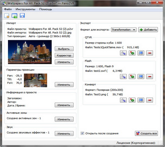 Pano2VR - приложение, для преобразования сферических или цилиндрических панорамных изображений в форматы QuickTime VR (QTVR) или Adobe Flash 8 и Flash 9/10 (SWF). С возможностью создания собственных шаблонов для панорам, кнопок, добавления анимации и звука, автоматическим вращением.