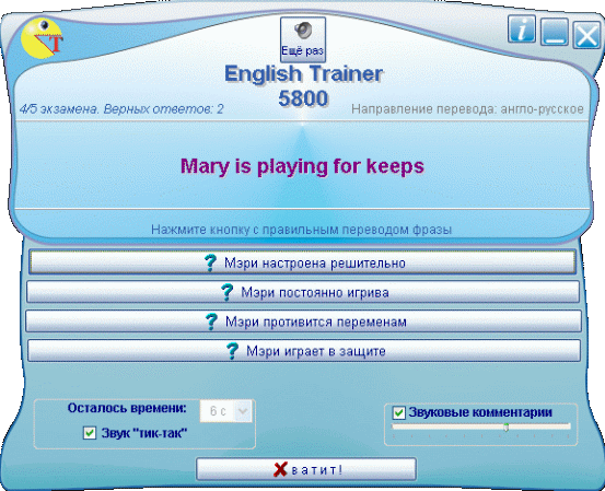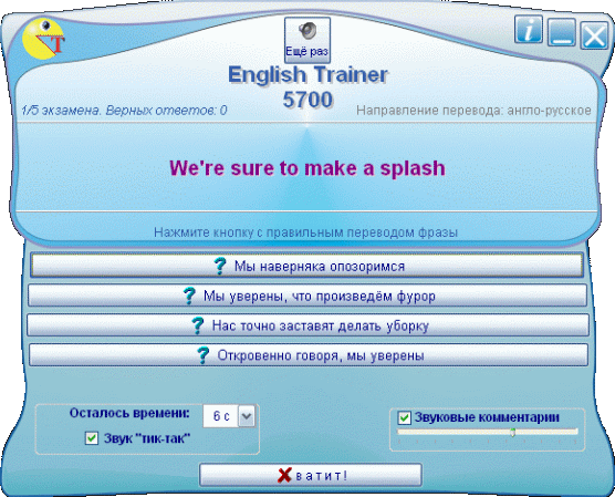 English Trainer - тренажер-экзаменатор профессиональных переводчиков. Для тех, кто думает, что знает английский. Предлагает задания профессиональной сложности на перевод фраз. Выставляет оценку. Номер версии программы соответствует количеству имеющихся в ней заданий.