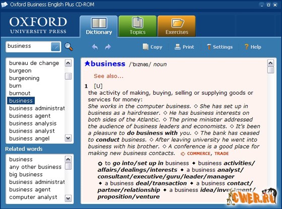Оксфордский Бизнес Словарь содержит более 30000 слов, фраз и значений. Иллюстрации, познавательные и четкие, помогают для описания сложных понятий. Вы также найдете множество упражнений, которые помогут в усвоении материала. Он пригодиться как студентам для изучения английской бизнес терминологии, так и людям которые используют английский в бизнесе.