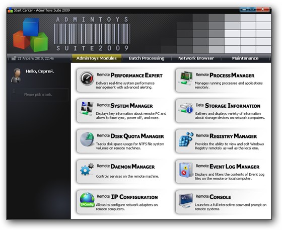 AdminToys Suite - набор инструментов необходимых для повседневной работы системных администраторов. Программа поможет вам: управлять активными процессами дистанционно; осуществлять мониторинг производительности компьютеров в сети; устанавливать процент использования дискового пространства на удаленных машинах; производить синхронизацию часов компьютера всей Вашей сети; выполнять запланированные перезагрузки / выключения компьютеров по сети; удаленно выполнять команды на группы компьютеров или всего домена; настраивать сетевые адаптеры дистанционно; просматривать и изменять ключи реестра Windows на удаленных компьютерах; осуществлять контроль удаленных компьютеров; просматривать все события; собирать по сети информацию, статистику и экспортировать в CSV, TXT или HTML форматы.