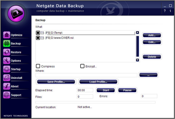 NETGATE Data Backup является эффективным инструментом для резервного копирования ваших файлов, фотографий, музыки и любых важных данных на вашем компьютере. С NETGATE Data Backup можно даже сделать резервную копию MySQL / PHP баз данных с вашего сайта или блога. Дефрагментация и резервная копия реестра одним простым нажатием кнопки. NETGATE Data Backup поддерживает расписание для автоматического резервного копирования в заданное время. Для расширенной безопасности пользователя имеет опцию шифрования и сжатия резервного хранилища.