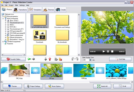 Photo Slideshow Creator представляет собой удобный инструмент, предназначенный для создания слайд-шоу с музыкой и с красивыми эффектами перехода. Программа позволяет добавлять неограниченное количество фотографий и подписей, применять темы и многое другое. После создания слайд-шоу могут быть сохранены как исполняемый файл (EXE), заставки и видео, включая Full HD. Photo Slideshow Creator имеет удобный, многоязычный интерфейс, прост в освоении. Создание памятного слайд-шоу высокого качества в течение нескольких минут! Новая версия включает в себя способность записывать слайд-шоу на DVD.