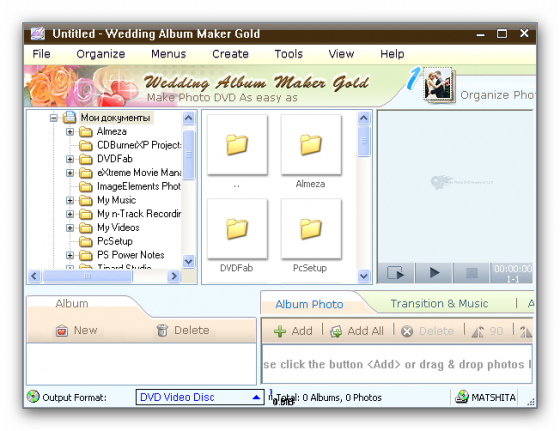 Wedding Album Maker Gold – это профессиональная программа для создания фотоальбома, которая создает впечатляющее слайд шоу из свадебных фотографий с музыкой, переходами и DVD меню. Данная программа позволяет быстро и легко создавать впечатляющие свадебные альбомы на DVD видео дисках. Новая версия поддерживает больше выводных форматов, такие как: MPEGI, MPEGII, MPEG-4, MP4 for iPod, PSP, 3GP сотовые телефоны, FLV , XVid AVI, AVI, видео форматы для Anrchos, Creative Zen Vision, iRiver PMP 100, YouTube, MySpace.