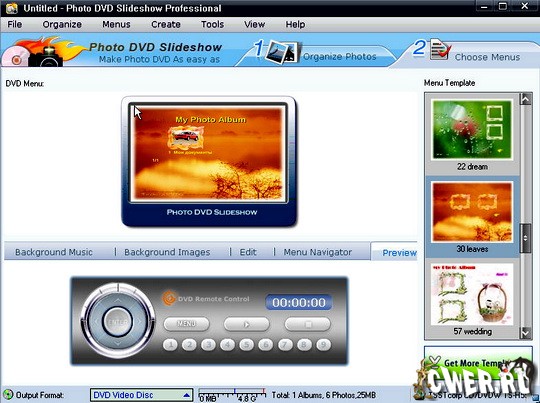 Photo DVD Maker Professional - программа является мощным и удобным в работе приложением для создания ошеломляющих слайдшоу. Являетесь ли вы экспертом или новичком, это не имеет значения, программа проста и удобна в обращении. Особенности: создание непрерывного слайдшоу из фотографий или видео роликов неограниченного колличества, наложение и соединение со звуковыми файлами (фоновая музыка), тектами, создание титров и субтитров, наложение эффектов перехода, создание проекта и прожиг в DVD,VCD или SVCD форматах для последующего просмотра на любом домашнем проигрывателе, iPod, Sony PSP или мобильном телефоне.