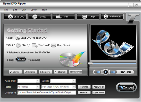 Tipard DVD Ripper - мощная и простая в использовании программа для копирования DVD-дисков с возможностью преобразования содержания в аудио и видео файлы, такие как AVI, MPEG, WMV, DivX, MP4, H.264, RM, MOV, M4V, XviD, 3GP, MP3 , WMA, WAV, RA, M4A, AAC, AC3, OGG и т.д. Программа может создавать файлы совместимые с IPod, iPhone, PSP, Apple TV и других портативных устройств. Есть варианты для преобразования сегментов клипа, изменение размера, наложение эффектов, добавление логотипов, предварительный просмотр результатов. Существует пакетная обработка файлов, получение информации из баз данных в Интернете, и многие другие функции.