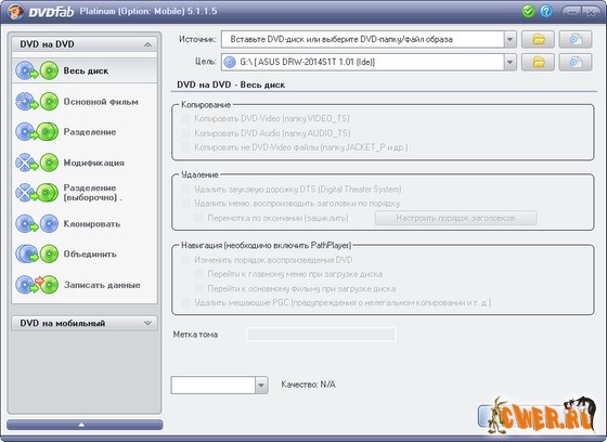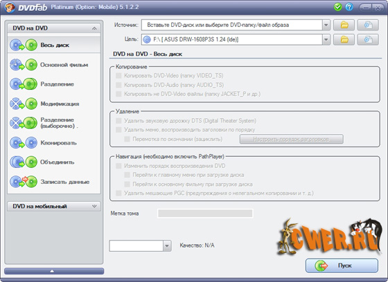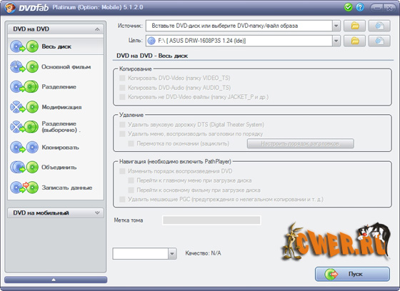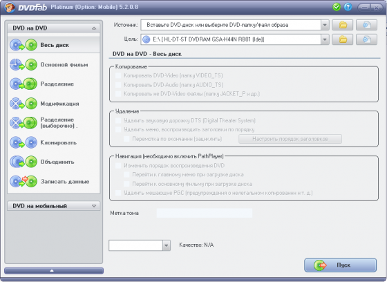 Ahead DVD Copy - программа, позволяющая быстро и качественно скопировать видео с DVD, позволяет создавать точные дубликаты DVD-дисков, разделить DVD9 на два DVD5 или сжать оригинальный DVD до нужных размеров. При использовании Ahead DVD Copy сохраняются все меню, бонусы и другие материалы DVD. Эта программа может скопировать диск на компьютер без потери качества либо переписать напрямую с одного привода на другой.