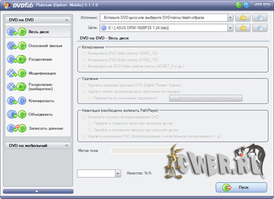 Arc DVD Copy - простой и быстрый инструмент для копирования видео DVD в том числе и защищенных. Подойдет как начинающим пользователям, так и продвинутым. Скопирует DVD-фильм за 20-40 минут! Поддерживает двухслойные диски, возможность редактирования меню, шифрования Ваших проектов и многое, многое другое!