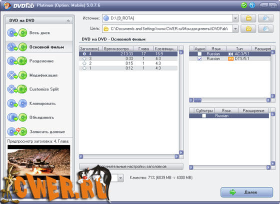 DVDFab Platinum – мощный, многофункциональный программный продукт для копирования DVD дисков с возможностями гибкой обработки видеопотока. Программа является одной из лучших на сегодняшний день, из инструментов для копирования, разбиения, пережатия и конвертирования DVD дисков с фильмами. Снимает все защиты и ограничения с диска и при желании пережмет диск большой емкости и вместит его в обыкновенную пустую DVD болванку с минимальными потерями качества (DVD9->DVD5) или разобъет фильм на два диска с полным переносом его меню, удалит всю рекламу, запишет только фильм и многое другое. Программа имеет интуитивно понятный, мультиязычный интерфейс включая русский.