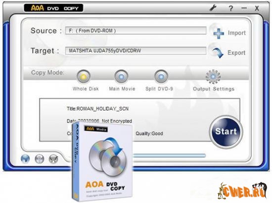 AoA DVD Copy это программа для копирования один к одному DVD дисков. Возможности утилиты: сохранение содержимого на жесткий диск с последующим прожигом, прямой прожиг непосредственно на DVD+R/RW носитель, полное сохранение структуры и файлов при копировании, разбиение dual-layer (DVD9) дисков на два single-layer (DVD5) диска, поддержка NTSC и PAL систем, копирование защиты CSS, обход региональных и Macrovision защит, высокая скорость и высокое качество работы.