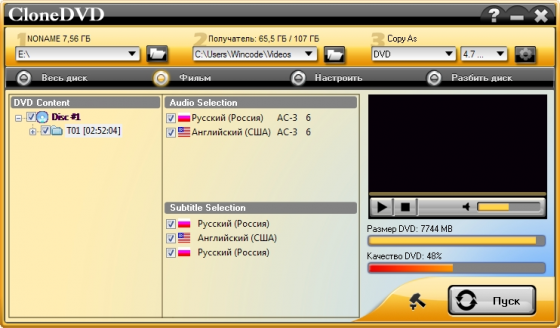 DVD X Studios CloneDVD предназначена для создания полностью идентичных копий DVD-фильмов и их записи на DVD-носители. Программа может полностью переписать содержимое диска, что позволяет создавать копии в режиме 1:1 (со всеми меню, субтитрами и т.д.). CloneDVD поддерживает работу с большинством существующих приводов, обладает хорошим быстродействием и качеством записи. Имеется русский интерфейс.