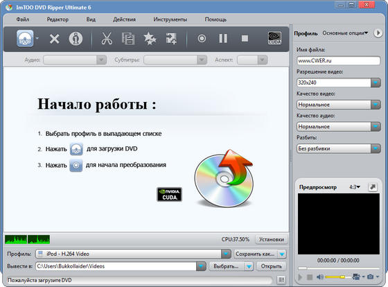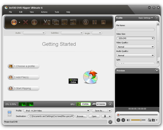 ImTOO DVD Ripper Ultimate - это одна из лучших программ на сегодняшний день по конвертации DVD и созданию рипа непосредственно с DVD диска (совместная разработка ImTOO Software Studio и Xilisoft Corporation). Конвертирует DVD в любые видео и аудио файлы, воспроизводимые на многих цифровых мобильных устройствах (PSP, PS3, iPod, iPhone, Apple TV, Archos, iRiver PMP, Creative Zen, мобильные телефоны, смартфоны). А теперь программа поддерживает и технологию NVIDIA® CUDA™.