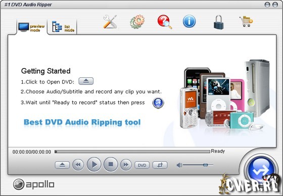 Обновилась мощная и очень простая в использовании утилита #1 DVD Audio Ripper, служащая для копирования аудио с DVD-дисков. При помощи #1 DVD Audio Ripper вы сможете сконвертировать музыку с DVD в форматы MP3, WAV, OGG и WMA. Среди прочих возможностей есть возможность создания MP3-файлов с тегами ID3, пакетная обработка, а также простой и удобный интерфейс.