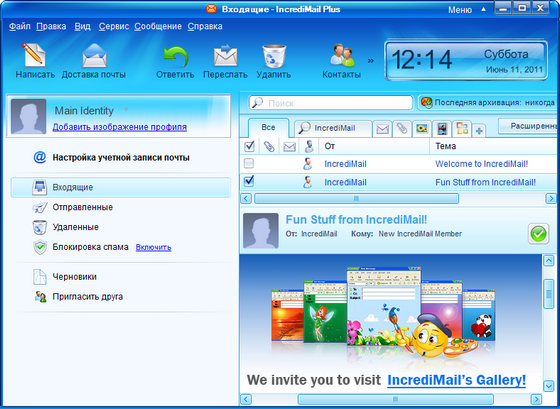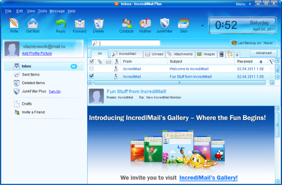 IncrediMail - главной целью при разработке данного инновационного продукта было создание такого почтового клиента, который, помимо большой функциональности, отличался бы и беспрецедентным для программ данного класса интуитивно-понятным интерфейсом. Помимо этого, работа велась над воплощением в IncrediMail обширных возможностей для проявления пользователями своих индивидуальных склонностей и эмоциональном самовыражении при помощи почты.