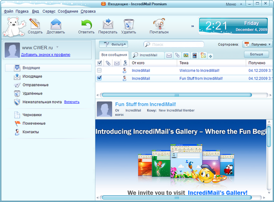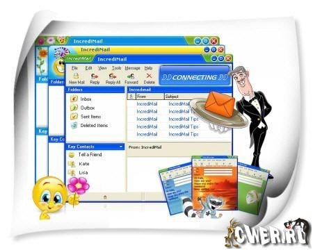 IncrediMail: Очень оригинальная почтовая программа, причем главная ее особенность - не набор функций по обработке корреспонденции (хоть и их немало), а совершенно новые, не имеющиеся ни в одной из других почтовых программ, возможности по оформлению писем с помощью анимации, создания "прыгающего" текста, включения в текст графических смайликов и многого другого, включая самые разнообразные 3D-эффекты.