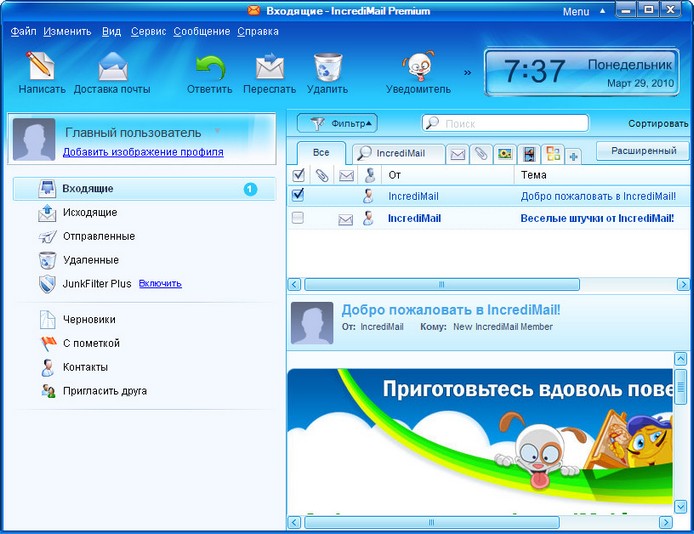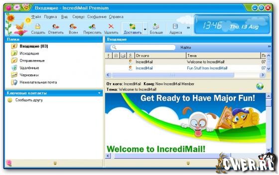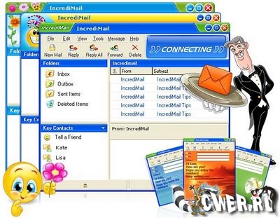 IncrediMail: Очень оригинальная почтовая программа, причем главная ее особенность - не набор функций по обработке корреспонденции, а совершенно новые, не имеющиеся ни в одной из других почтовых программ, возможности по оформлению писем с помощью анимации, создания "прыгающего" текста, включения в текст графических смайликов и многого другого, включая самые разнообразные 3D-эффекты.