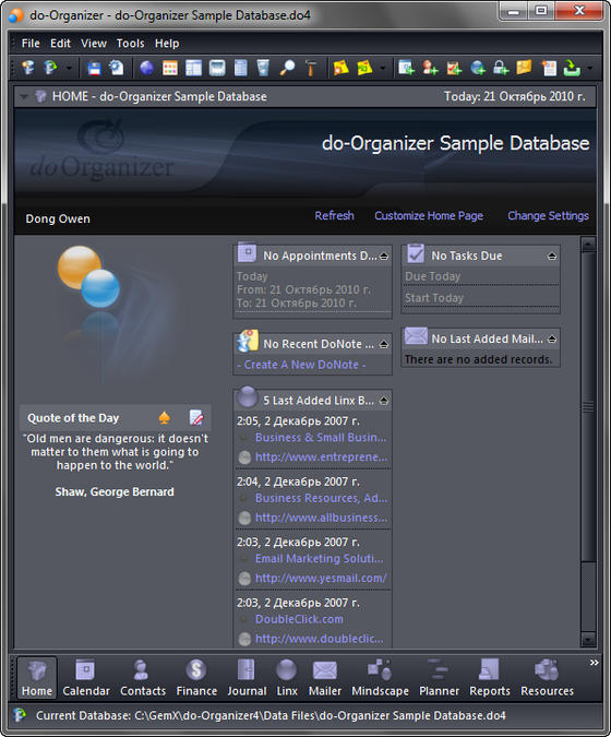 do-Organizer - мощный и гибко настраиваемый персональный информационный менеджер, в котором разработчики попытались совместить все, что может пригодиться современному человеку при управлении делами и входящим потоком информации. Для быстрого доступа в программе есть панель mini-bar, которую можно прикрепить к любой части экрана. В свернутом состоянии она представляет собой узкую полоску, которая при наведении курсора раскрывается и предоставляет доступ к основным функциям.