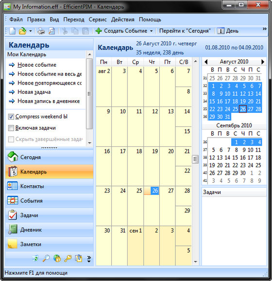 EfficientPIM - полнофункциональный Персональный Информационный Менеджер, который поможет вам организовать и спланировать вашу рабочую и личную жизнь. С помощью этой программы можно отслеживать контакты, встречи, задачи, дни рождения, хранить заметки, вести дневники и даже хранить пароли с помощью встроенного менеджера паролей. Для того, чтобы стать успешным предпринимателем или просто человеком - нужно быть организованным и эффективным, в чем вам и поможет данная программа. Программой поддерживается создание нескольких независимых профилей для каждого пользователя, а также выбор индивидуального интерфейса.