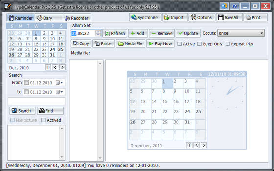 Программа совмещает в себе календарь на рабочем столе, мультимедийный напоминальщик, часы, дневник с возможностью шифрования данных и устройство записи звуков. Календарь может занимать любое место на рабочем столе, при этом для него можно установить любой процент "невидимости", чтобы он не мешал, но в то же время был перед глазами.
