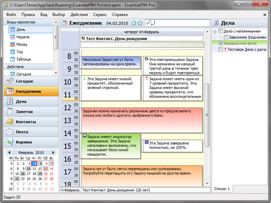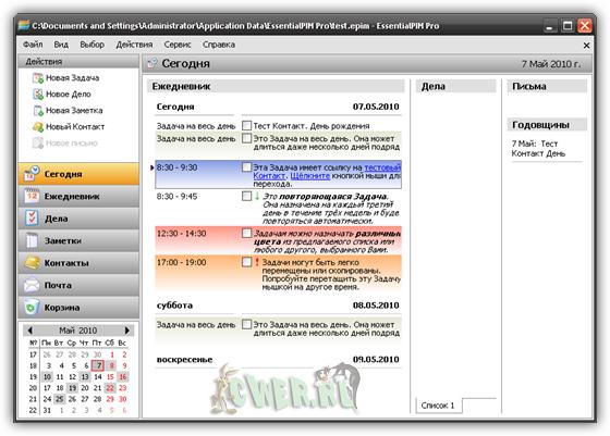 EssentialPIM - это комплексный менеджер персональной информации, отличающийся продуманным интерфейсом и обилием функций. Включает в себя средства для работы с календарем, списком задач, заметками и контактами. Среди особенностей - широкие возможности для печати, импорта и экспорта информации, возможность запуска с переносных USB накопителей (включая U3 SmartDrive- сертифицированную версию), синхронизация с карманными компьютерами и смартфонами работающими под управлением WindowsMobile, PalmOS. Поддерживается 128-битное шифрование, экспорт/импорт данных из MS Outlook, Windows Address Book, расширенный поиск, различные опции печати. Имеется инструмент для хранения контактов с неограниченным количеством полей.