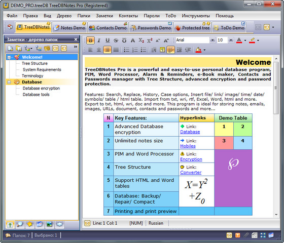 TreeDBNotes Pro - удобное в работе приложение сочетающее в себе функции органайзера, менеджера контактов, менеджера паролей, текстового процессора и базы данных. Программа имеет интуитивный, настраиваемый интерфейс, в том числе и русский.