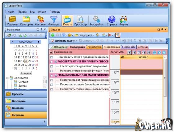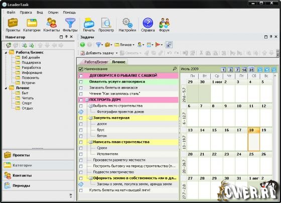 LeaderTask - это умный органайзер для лидеров! Интеллектуальная система управления проектами, событиями, задачами, контактами, освободит вас от рутины и даст больше времени для творчества. LeaderTask поможет вам избавиться от различных поглотителей времени, поможет вам увидеть четкую перспективу жизни, иметь подробный обзор дел, задач, вы будете ставить более высокие цели и достигать их. Кроме того, LeaderTask - это еще и удобный менеджер проектов, с помощью которого можно легко планировать и управлять вашими личными делами, а также бизнес проектами.