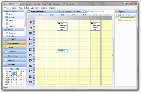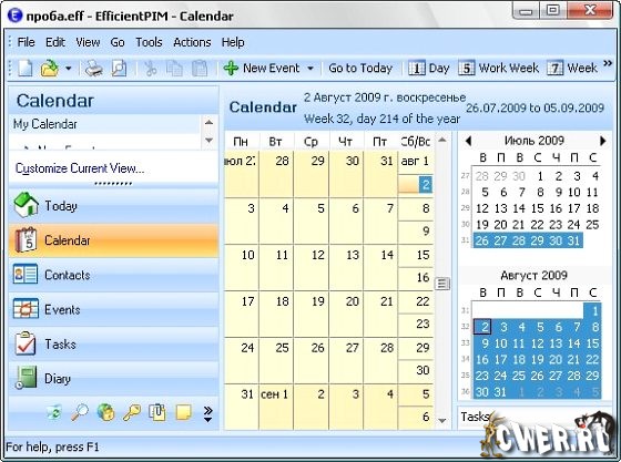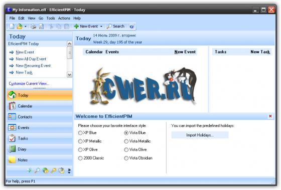 EfficientPIM - эффективный полнофункциональный Персональный Информационный Менеджер (PIM), дополненный модулями: заметок-напоминаний в виде "липких листочков" на экране; менеджера любимых закладок интернет-браузера и пароль-менеджера с генератором паролей. Все это, вместе собранное, в виде контактов, назначений, задач, списков "сказано-сделано", годовщин и дней рождения близких и знакомых людей и прочего, сделает вашу жизнь более плодотворной и успешной, а работу более организованной и эффективной. И как это хорошо, что с EfficientPIM все вещи, которыми вы должны управлять, расположены теперь в одном, удобном в работе интерфейсе.