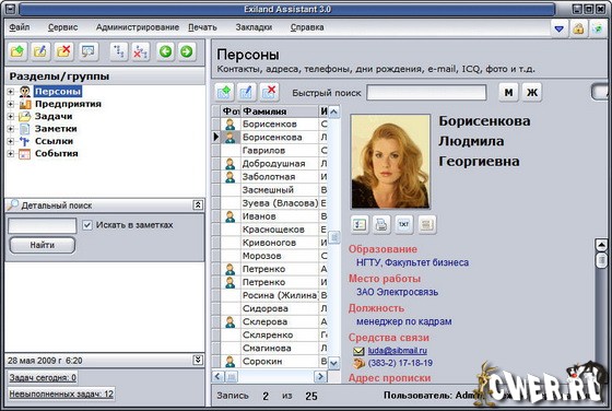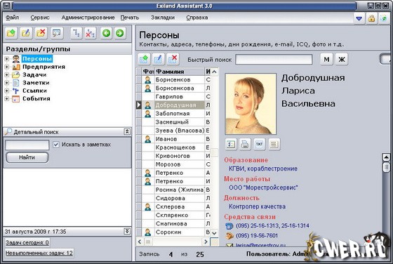 Электронный органайзер Exiland Assistant - это не просто планировщик задач или ежедневник. Кроме функций классического органайзера он может использоваться как база клиентов, программа CRM, программа записной книжки (pim) для хранения контактов людей и предприятий, заметок (статей, документов, хранения паролей, рецептов и т.п.), ссылок интернета, событий, праздников, юбилеев. Электронный ежедневник содержит удобный планировщик задач с напоминалкой.