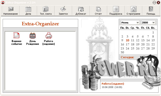 Extra-Organizer – планировщик, телефонный справочник, календарь, будильник и менеджер дел. Первая версия программы была создана в 2004 году под названием Message Service, затем в 2007 году алгоритм, интерфейс и принцип работы программы были усовершенствованы. Так появился Extra-Organizer. Программа превосходит многие другие органайзеры по функциональным возможностям, стабильности и удобству в использовании.