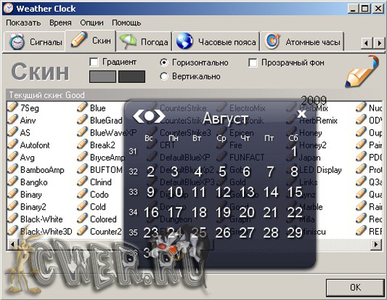 В любое время дня или ночи вы увидите погоду, температуру, дату и время, всего лишь бросив взгляд на трей, где до этого стояли уродливые и безликие часы Windows! Все 33 удовольствия включены в скромный погодный хронометр: выезжающий календарь; 100 видов, на выбор, симпатичных часов; музыкальное оповещение установленных заранее событий с забавными иконками; текущая погода и ее прогноз на 5 последующих дней; всевозможные индивидуальные настройки, ну и само собой, - “атомная синхронизация” системного времени.