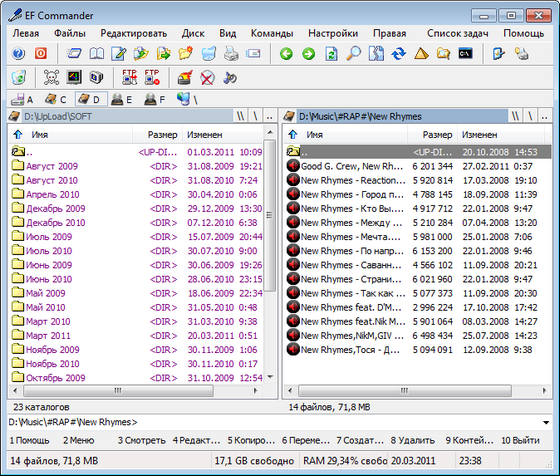 EF Commander - файловый менеджер, который работает в многозадачном режиме, поддержка drag and drop, работа со всеми распространёнными архивами. Есть внутренний просмотрщик такого числа расширений как ANI, AVI, BMP, CUR, DBF, DIB, EMF, GIF, HEX, HTML, ICO, JPEG, LIB, LNK, MID, MP3, MPG, PCX, PNG, PX, RLE, RMI, RTF, TGA, TIFF, TXT, WAV, WMF, XBM и XPM, а также хорошо настраиваемый интерфейс. Кроме этого есть много дополнительных функций: FTP-клиент, встроенный текстовый редактор с поддержкой HEX-редактирования, допустима синхронизация директорий, работа из командной строки с сохранением истории, управление горячими клавишами и многое другое.