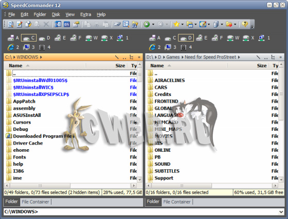 SpeedCommander - файловый менеджер с многочисленными, в том числе и уникальными, возможностями по работе с файлами. Из не совсем обычных функций имеет смысл обратить внимание на мощную систему шифрования файлов (файлы сжимаются - внутренняя поддержка ARJ, ZIP, LHA, RAR, CAB, ACE, GZIP, TAR и UUE, затем шифруются по стойкому алгоритму DES, а потом ещё и их названия можно защитить паролем). Кроме этой довольно редко встречаемой опции, в SpeedCommander имеется встроенная поддержка просмотра около восьми десятков графических и текстовых форматов; есть полнофункциональный текстовый редактор с подсветкой синтаксиса и не менее полнофункциональный ftp-клиент.