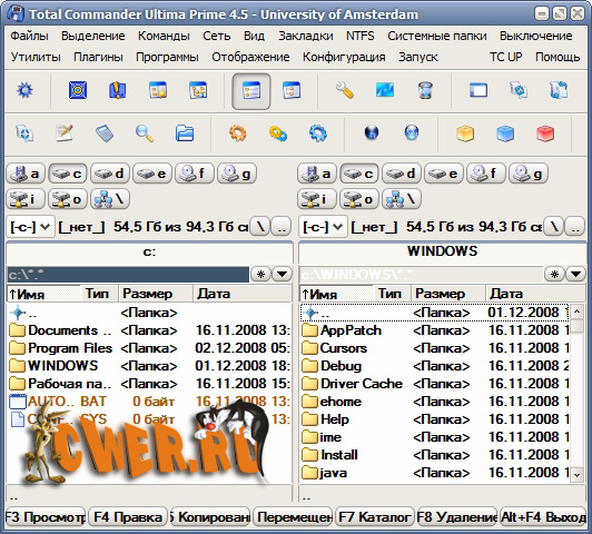 Total Commander - популярный файловый менеджер с практически всеми необходимыми для таких программ функциями. Кроме всех функциональностей, характерных для файловых менеджеров, в Total Commander встроены очень удобные просмотрщики для мультимедиа и графических файлов, распаковщики ZIP, ARJ, LZH, RAR, UC2, TAR, GZ, CAB, ACE и дополнительные dll для других архивных файлов; встроенный ftp-клиент - вообще просто прелесть: можно скачивать/закачивать файлы в несколько потоков, есть докачка, поддержка www-прокси при работе с ftp и есть даже такая функция, как подключение-скачивание-отключение в заданное время к заданному ftp.