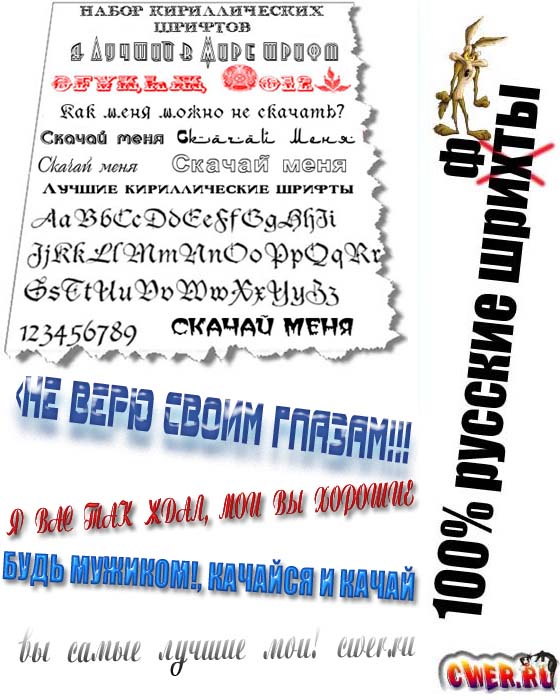Предлагаю вам скачать новую коллекцию шрифтов в форматах True Type и Open Type, необходимых для оперативной и успешной работы дизайнера. Ценностью данной коллекции является кропотливая работа по отбору, сортировке и проверке большинства шрифтов. Большинство шрифтов обязательно содержат кириллический набор символов. В архиве присутствуют авторские шрифты (без поддержки кирилицы), которые найдут свое применение и станут полезным подспорьем в дни различных праздников. Применение данных шрифтов разнообразно широко, от кулинарных книг до открыток любимым и прочих ваших творческих фантазий вместе с сайтом cwer.ws.