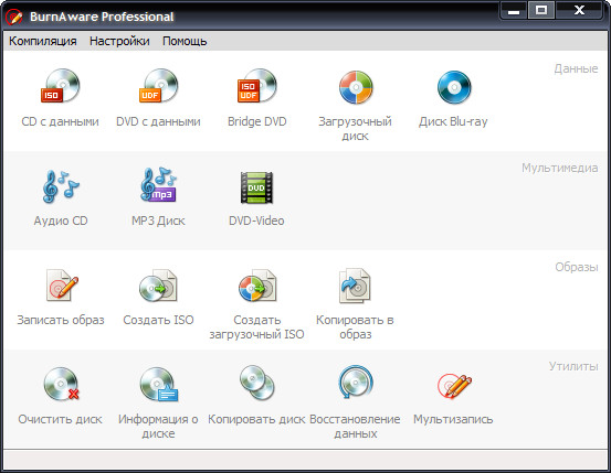 BurnAware Free - относительно небольшая, бесплатная и простая в использовании программа для записи информации и музыкальных композиций на CD, DVD, Blu-Ray и HD-DVD диски, которая пригодится как опытным пользователям, так и новичкам. BurnAware поддерживает работу со всеми типа оптических дисков (включая CD-R/RW, DVD-R/RW, DVD+R/RW, BD-R/RE, HD-DVD-R/RW и DVD-RAM) и аппаратными устройствами записи. Утилита поддерживает создание образов, способна писать мультисессионные диски, имеет опцию проверки записанного содержимого, работает под операционными системами Windows 98/ME/NT/2000/XP/Vista (32/64-bits).