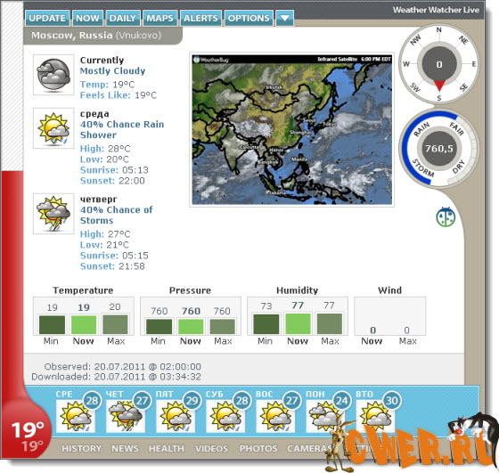 Weather Watcher Live – программа, представляющая собой портативную Windows–метеостанцию, работающую в реальном времени. Программа выполняет основные метеофункции, такие, как прогноз погоды на ближайший час, неделю, месяц. Также присутствует оповещатель, который предупредит вас о ближайших изменениях погоды. Программа имеет навигационную карту мира, в базе которой учтены тысячи городов по всему миру. Четко сбалансированный интерфейс позволяет управлять программой и получать всю нужную информацию несколькими нажатиями кнопок мыши. Уникальность программы проявляется еще и в том, что она создает обои, отображающие полную информацию в реальном времени о погоде в любом городе.