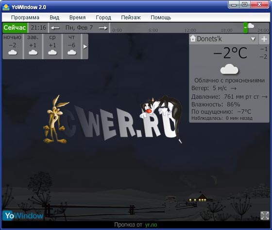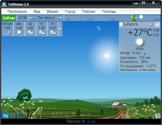 YoWindow - современная утилита для отображения прогноза погоды, это необычная и уникальная программа при помощи неё вы можете не смотря на цифры определить погоду, потому что все погодные условия отображаются на красивом изображении в точности до расположения солнца. Вся погода на картинке реальна будь то облачность, дождь, снег, туман, трава движется вместе с ветром. Картинка проживает свою виртуальную жизнь и отображает реальные данные с природными явлениями и сменой дня на ночь.