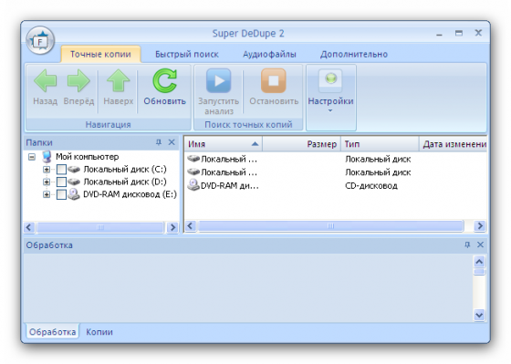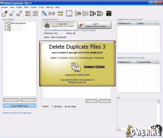 Имеет два режима сканирования, стандартный – побайтный: байт-К-байту и по контрольной сумме CRC32; и легкий, - по именам и размерам.