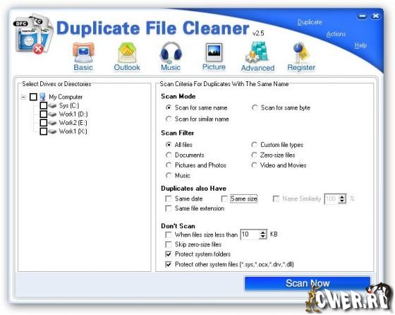 Duplicate Files Cleaner - мощная и профессиональный инструмент для 100% -го, "Бит-В-Бит" поиска и удаления одинаковых файлов с компьютера которые напрасно занимают место, тормозят работу жесткого диска и как следствие, снижают скорость работы самого компьютера. Duplicate File Cleaner - быстро находит и удаляет одинаковые файлы (дубликаты) независимо от их типа, - фотографии, музыку, видео или письма Outlook.